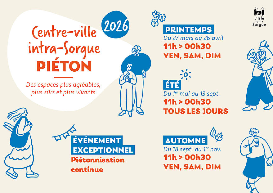 En 2026, la Ville de l’Isle-sur-la-Sorgue poursuit son dispositif de piétonnisation du centre-ville afin d’en faire un espace plus agréable à vivre, plus sûr et plus convivial. La mise en place de périodes de piétonnisation en centre-ville intra-Sorgue permet de réduire la circulation automobile à certains moments de l’année pour favoriser les déplacements à pied, les animations et la vie commerçante. La piétonnisation ne s’applique pas toute l’année de la même façon. Elle évolue selon les saisons afin de s’adapter aux habitudes de fréquentation du centre-ville. Elle s’applique sur l’ensemble du centre-ville ainsi que sur les quais du midi (Rouget de Lisle / Jean Jaurès).