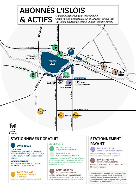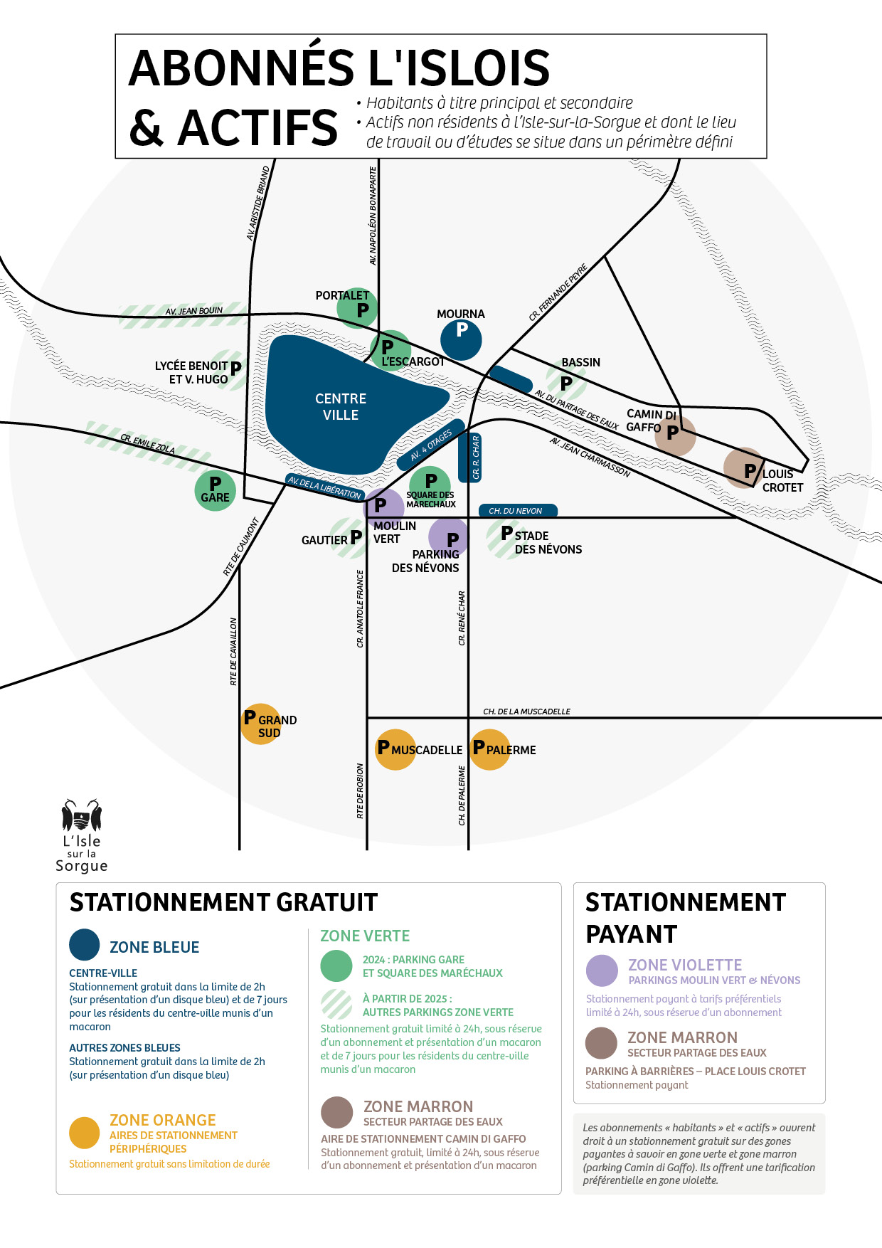 Il s’agit des parkings actuellement libres et gratuits suivants : parking de la gare, square des Maréchaux,parking de l'escargot et parking du Portalet. Avec l'abonnement, je pourrai stationner gratuitement sur ces parkings de zone verte, avec une durée limitée à 24h consécutives. Détenteur du macaron « abonné l’islois » accolé sur le pare-brise du véhicule, je ne suis pas tenu de passer par l’horodateur pour stationner.