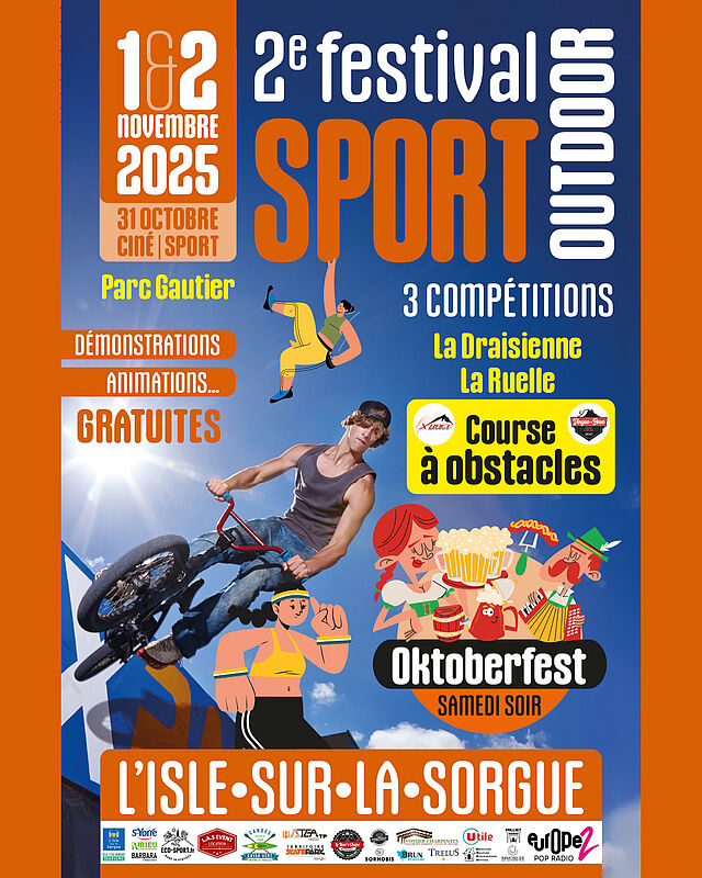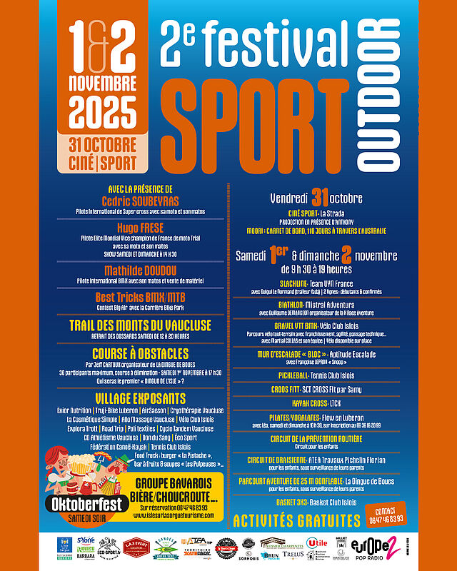 Envie d’un grand bol d’air, de sensations fortes et de moments festifs ? Le Festival Sport Outdoor revient pour une deuxième édition pleine d’énergie à l’Isle-sur-la-Sorgue ! Au programme : des démonstrations spectaculaires de BMX, moto trial et supercross avec des pilotes internationaux comme Cédric Soubeyras et Hugo Frese, des contests freestyle, des courses à obstacles, mais aussi une multitude d’activités gratuites pour petits et grands : escalade, slackline, biathlon, pilates/yogalates, basket 3x3, parcours aventure, et bien plus encore !