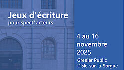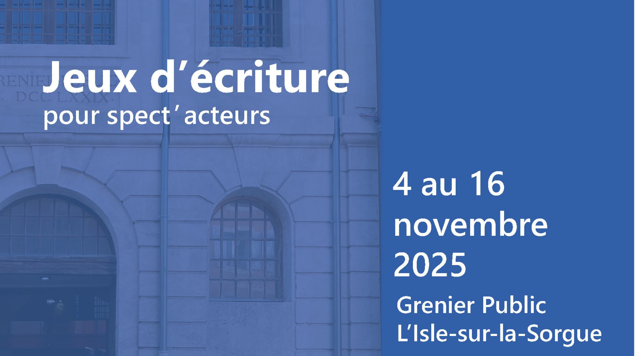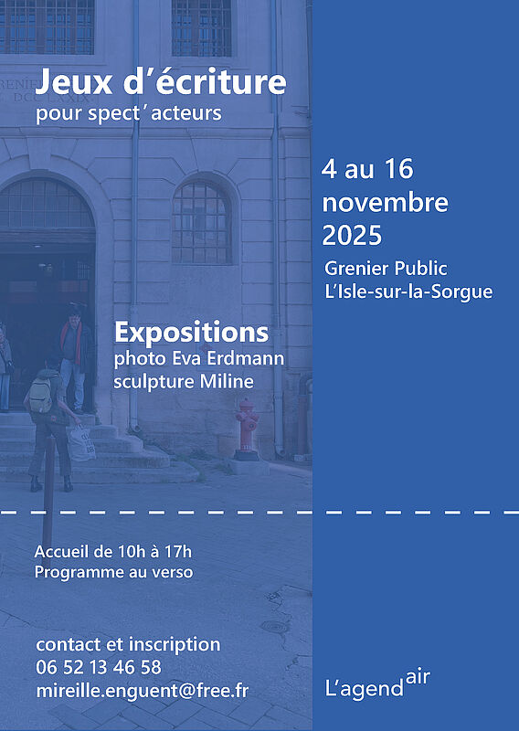 Le Festival de Jeux d’écriture aura lieu du 4 au 16 novembre au Grenier public de L’Isle, ouvert de 10 h à 17 h. Une exposition de photos d’Eva Erdmann et de céramiques de Miline sera visible durant toute la durée de l’événement.