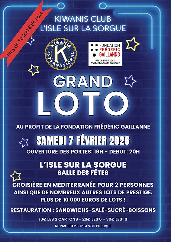 Samedi 7 février, venez participer au Grand loto du Kiwanis Club à la salle des Fêtes de l'Isle-sur-la-Sorgue.