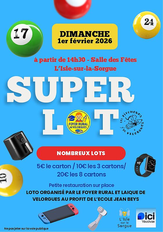 Venez participer au Loto du Foyer Rural et Laïque de Velorgues au profit de l'école Jean Beys. De nombreux lots sont à gagner alors venez tenter votre chance !