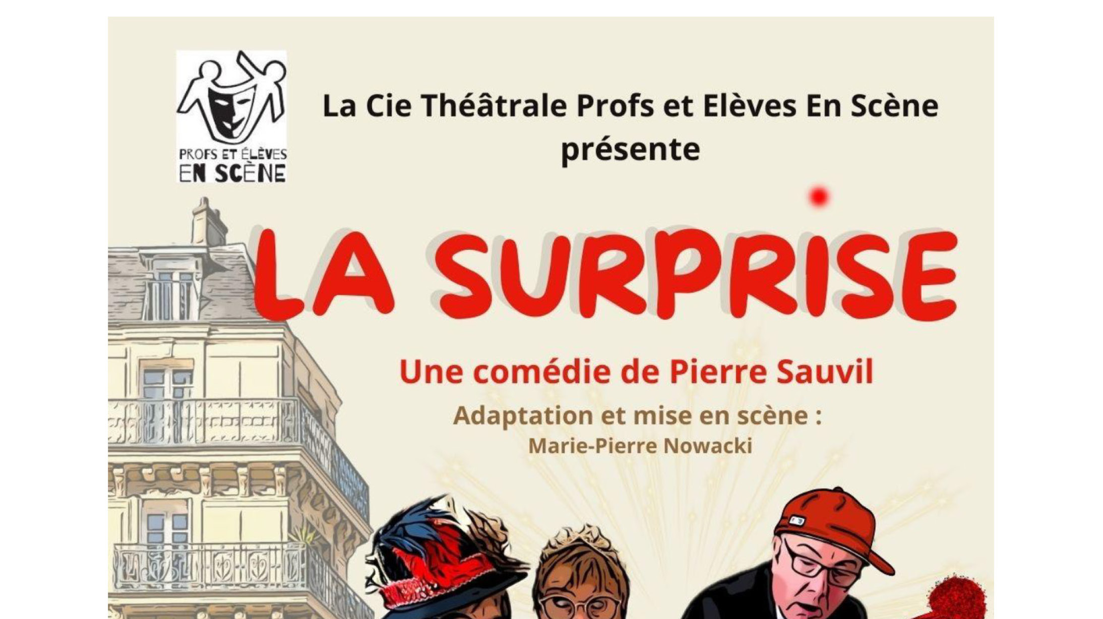 “LA COMPAGNIE PEES Profs et Elèves présente SURPRISE Une comédie de PIERRE SAUVIL Rien ne va plus chez les CHABRIER : Monsieur, PDG odieux et malhonnête amasse des millions, Madame se sentant délaissée souhaite divorcer ! Mais il refuse. C’est alors que M. MORIN, gentil locataire d’une chambre de bonne, solitaire et sans le sou, fait une tentative de suicide devant la porte des CHABRIER. Cette visite surprise pourrait bien servir les noirs desseins de Monsieur, prêt à tout pour ne pas voir sa fortune dilapidée … Adaptation et mise en scène de Marie-Pierre NOWACKI DUREE 1H20”