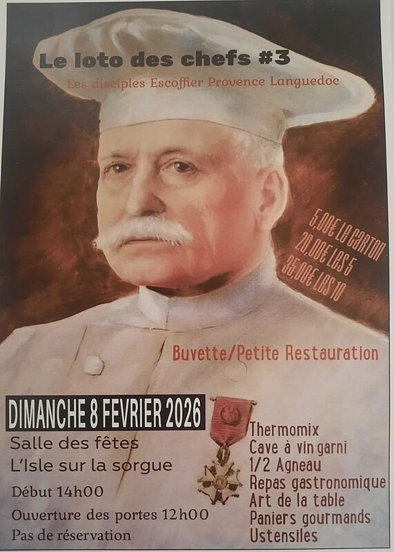 Les Disciples Escoffier délégation Provence Languedoc, vous invitent à leur loto caritatif le 8 février 2026 , à la salle des fêtes de l'Isle sur Sorgue.